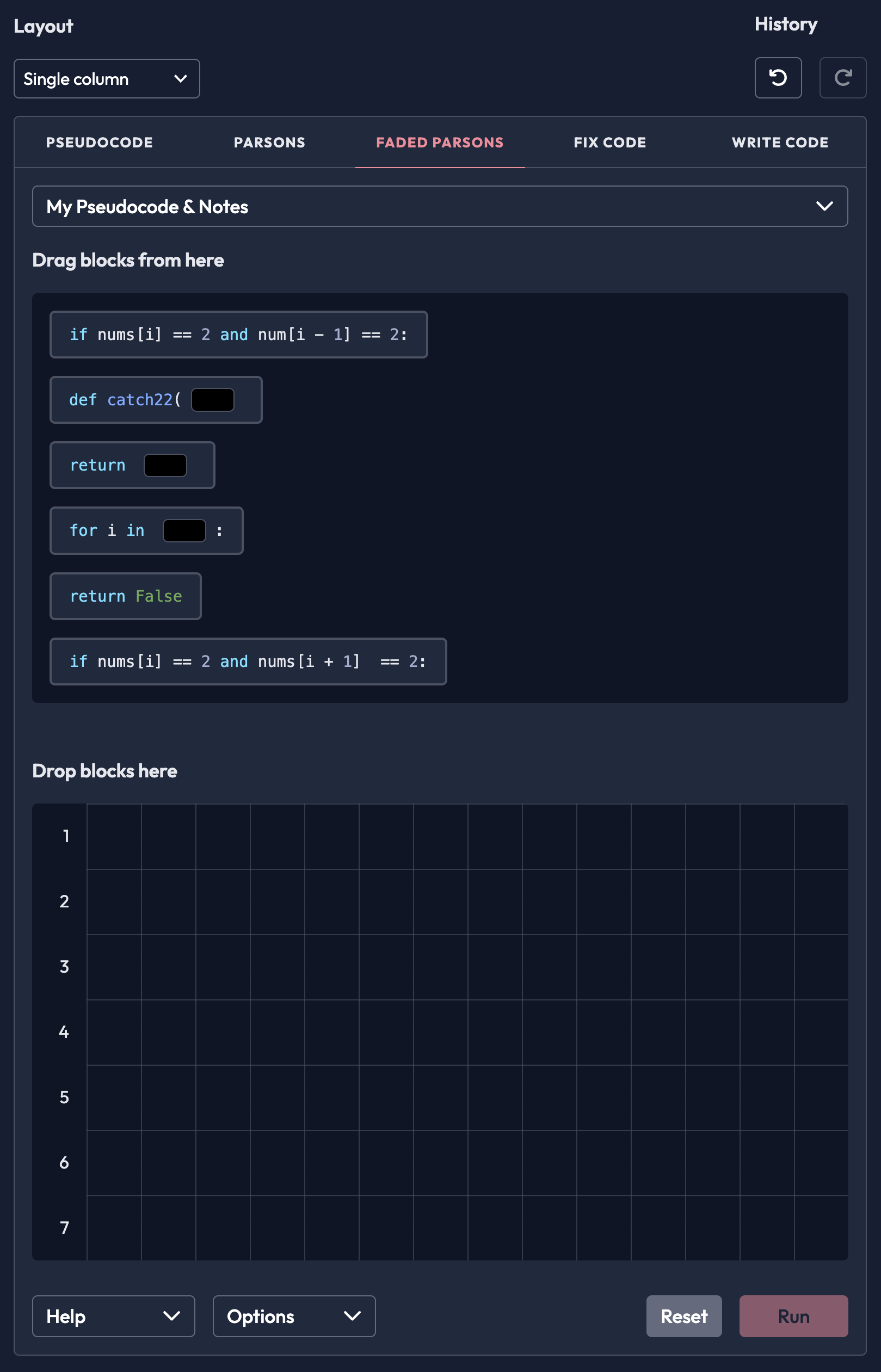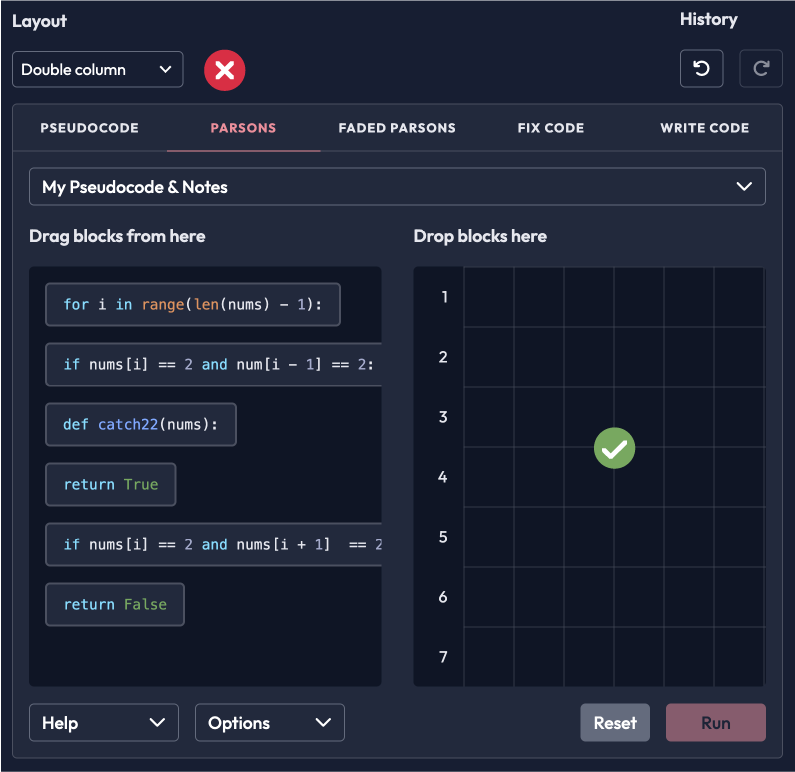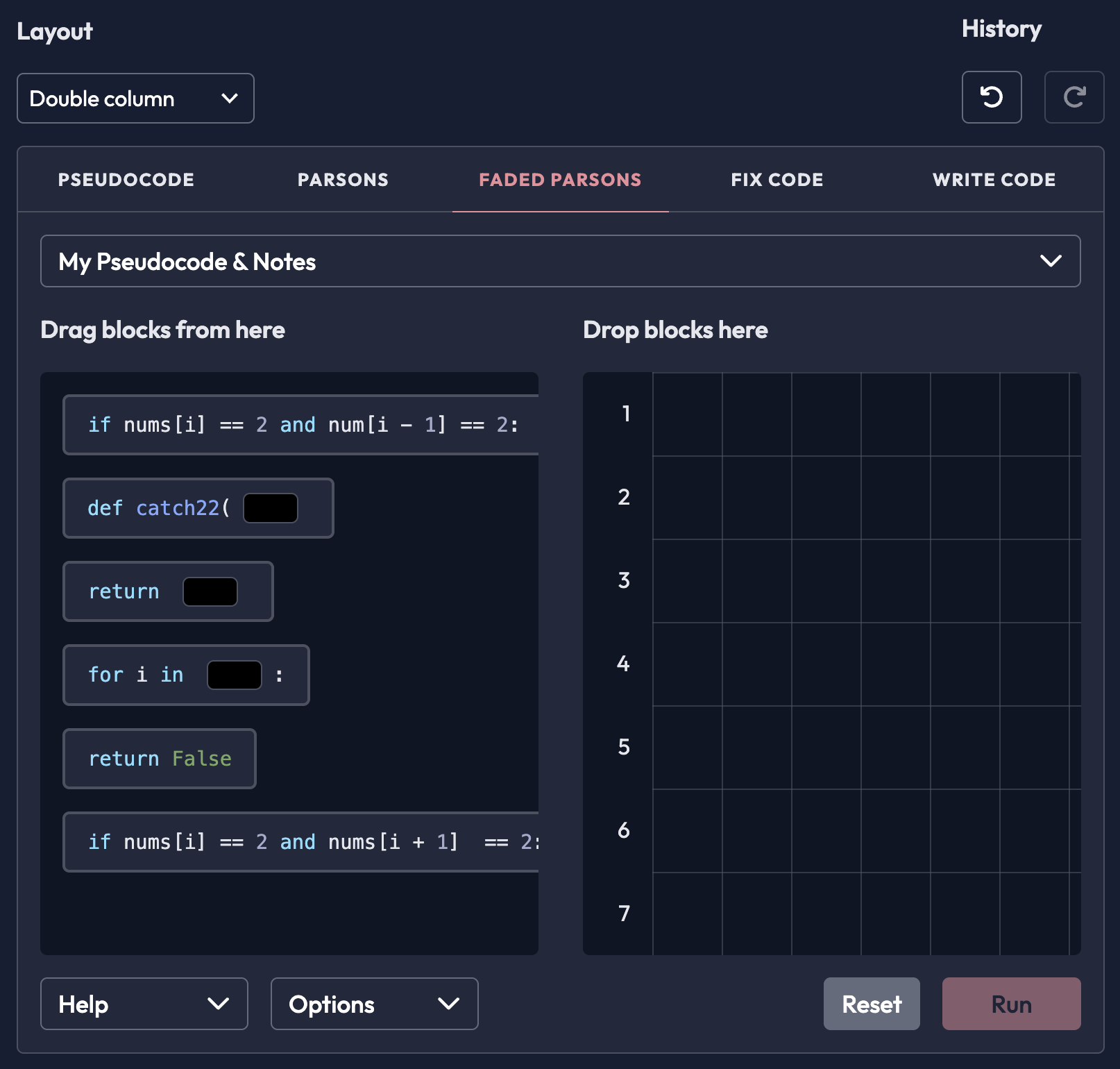Historically, Parsons problem libraries such as JSParsons have displayed block-based problems using a 2-column layout: mixed up blocks on the left and the solution area on the right.
