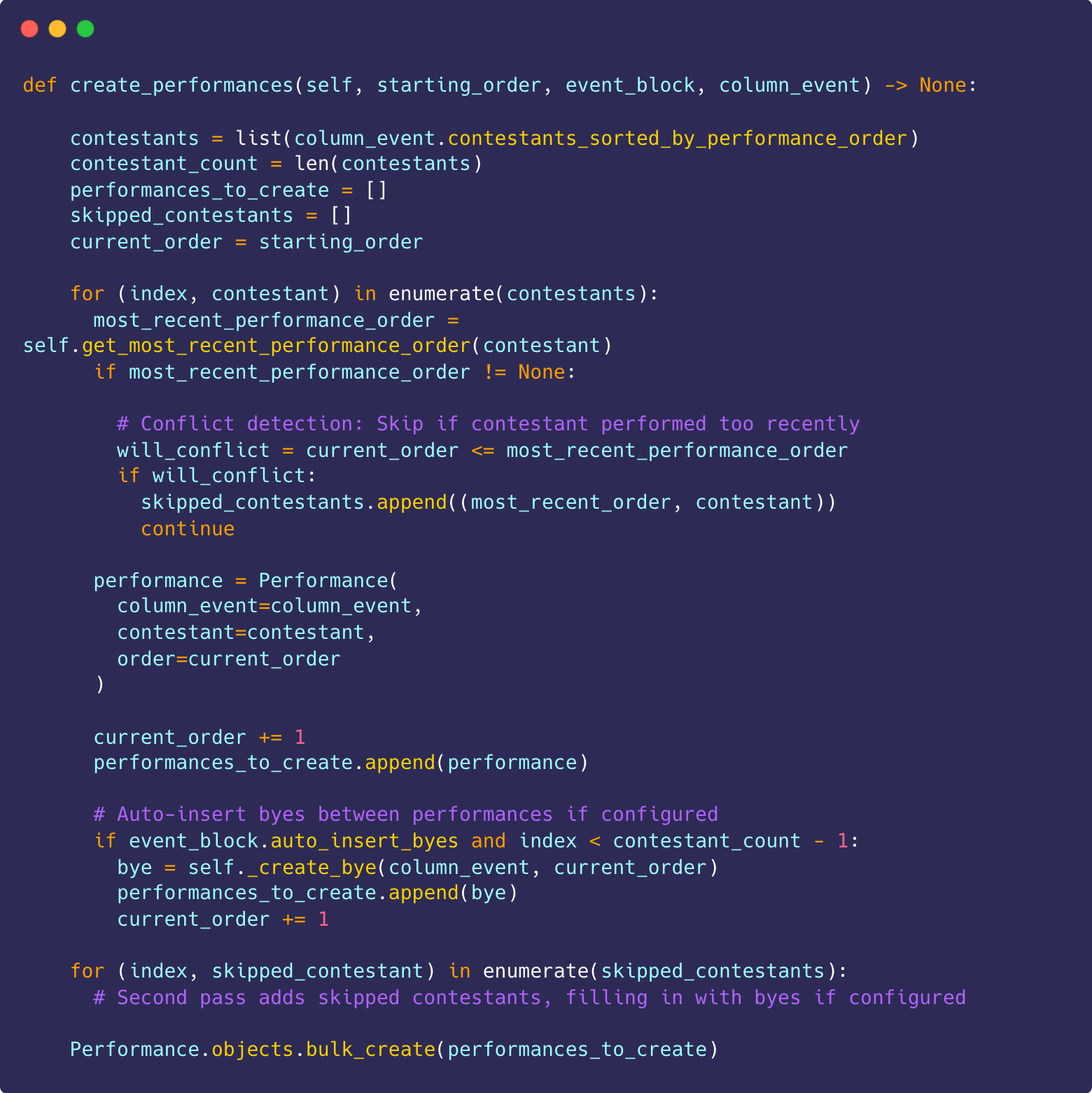 Bulk-creates all performances in a single database operation for speed