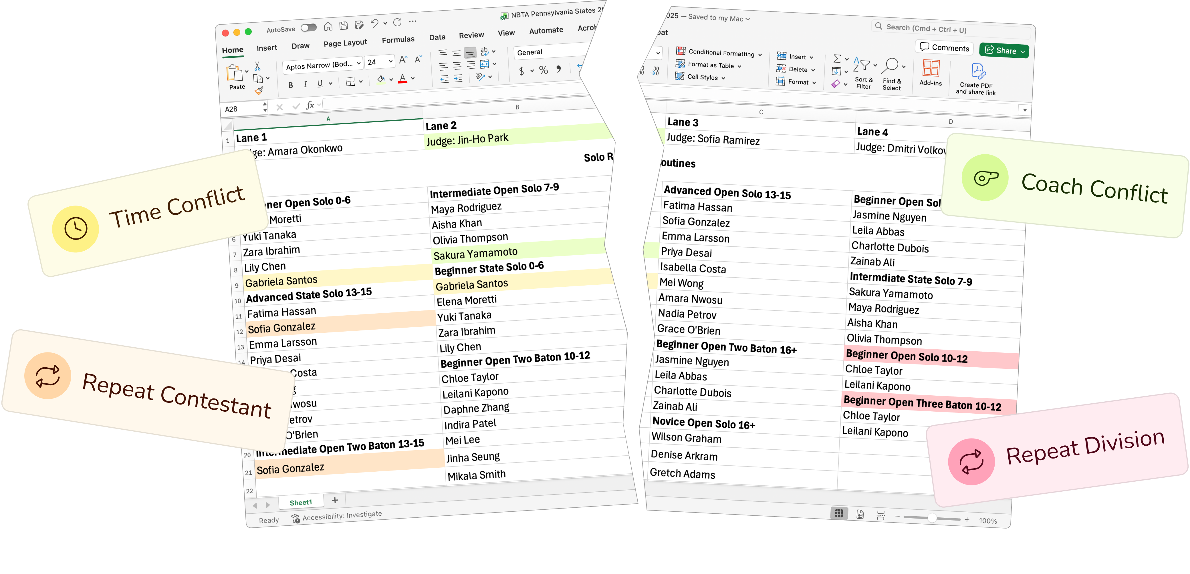 Contest organizers were spending 15+ hours building schedules in Excel. They'd manually add every contestant name, sort them into divisions, assign performance slots, then check for issues one by one. Find a conflict? Start over. Last-minute registration? Rebuild the whole thing.